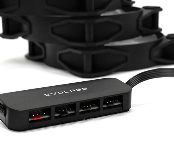 El HUB incluido admite cuatro interfaces para ventiladores (compatibles con conectores 3 pines y 4 pines) y cuatro puertos de iluminación ARGB. Su función PWM permite que la placa madre ajuste automáticamente la velocidad de los ventiladores entre 800 y 1600 RPM, mientras que la alimentación de la iluminación puede controlarse a través de un conector ARGB Header (1) o una conexión SATA.